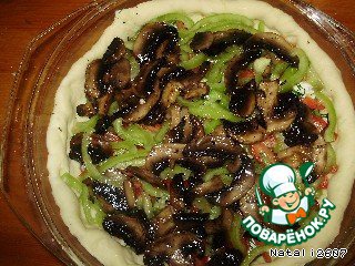Затем обжаренные шампиньоны на растительном масле. Раскатать вторую часть теста, закрываем пирог и защипываем. Украсить третьей частью теста и смазать все желтком яйца. Запечь в духовке минут 40 при 200 градусов.
