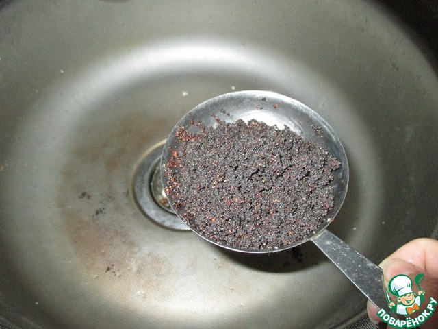 Мак заливаем кипятком, приблизительно 100 мл, так чтобы вода покрыла мак и накрываем крышкой, пусть напарится 5 минут.