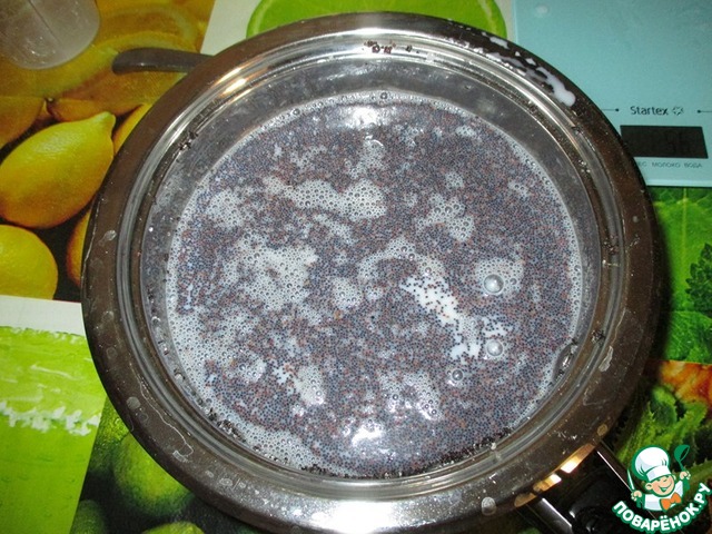 8. Затем маковую смесь заливаем молоком где-то 350 мл, в общем так чтобы молоко немного покрыло мак и ставим на огонь. Далеко от печки не отходим, а то начинка может сбежать.