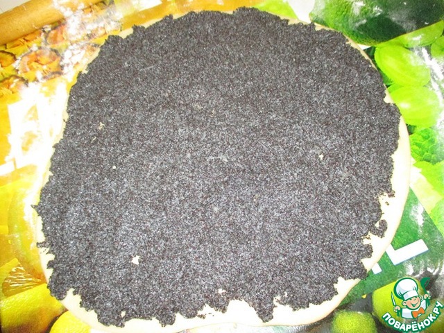 Тесто выкладываем на стол посыпанный мукой и раскатываем в прямоугольник, затем выкладываем половину начинки.