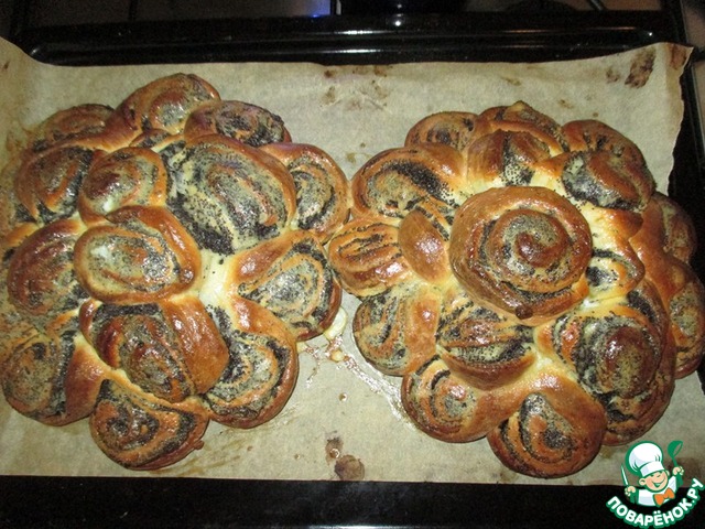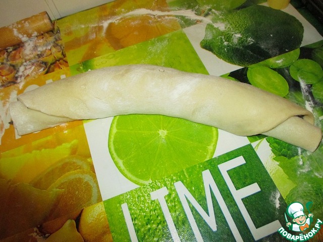 13. Перекладываем наш рулетик-калач на лист, застеленный пергаментной бумагой.