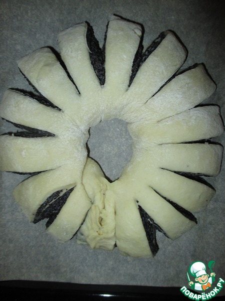 14. А теперь начинаем формировать пирог, для этого один лепесток поворачиваем внутрь, а два следующих оставляя снаружи, повернув набок. Дольки между собой немного скрепляем.