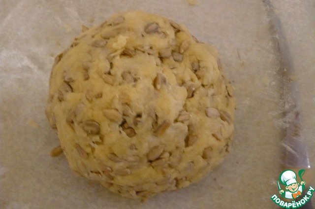 Сначала приготовим тесто. Муку смешать с семечками (не обжаривать). Масло растереть с мучной смесью до состояния крошек. Добавить воду и замесить мягкое тесто. Убрать в холодильник на 10 мин.