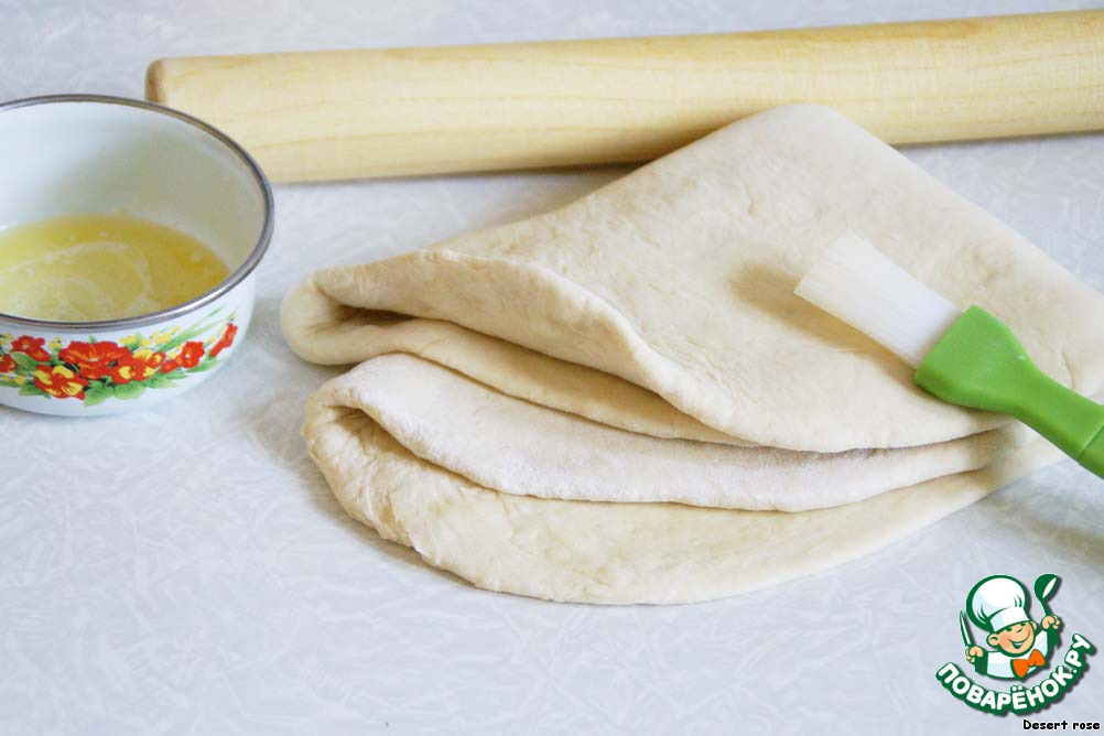 Сложить вчетверо. Проделать операцию еще пару раз. Не сминать тесто в шар, так и оставить сложенный четырехугольник.