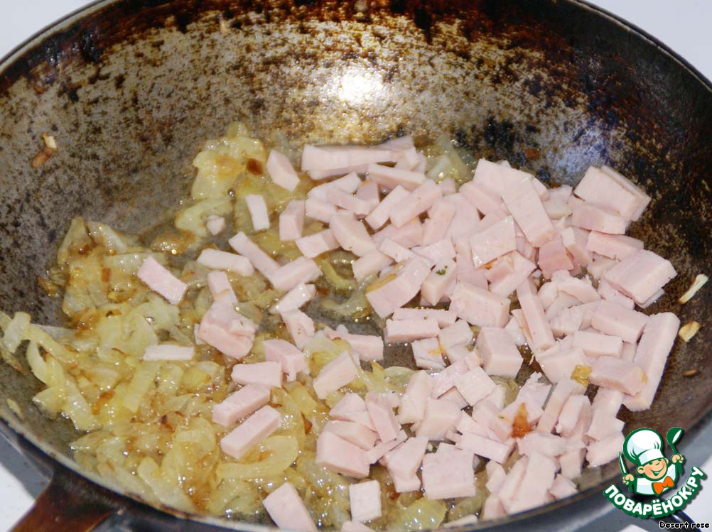 Обжарить лук, нарезанный четверть кольцами, и грудинку (как вариант - бекон) на растительном масле.
