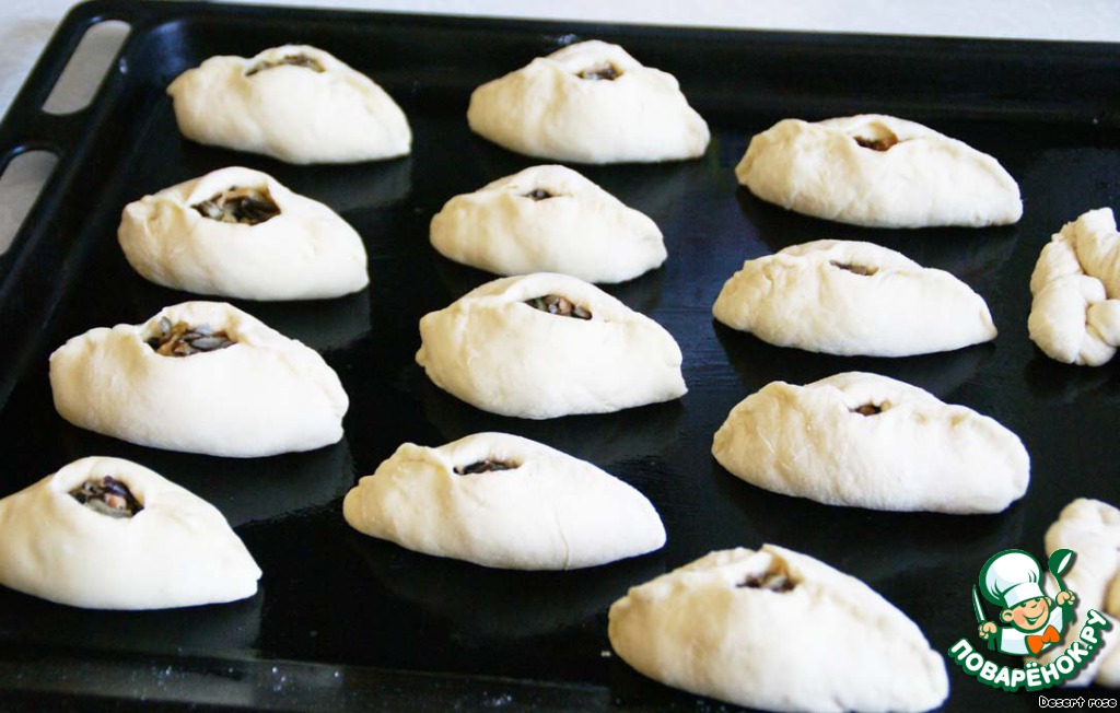 Уложить пирожки на противень и отправить в духовку, разогретую до 180 град. До золотистой корочки.