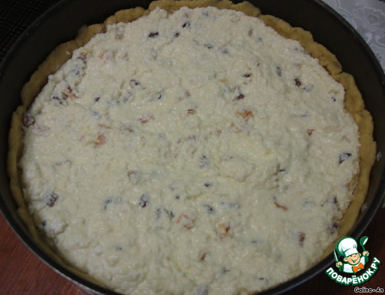 Приготовим начинку: яичный желток растереть с маслом, сахаром, цедрой. Творог смешаем со сметаной, разрыхлителем + желтковый крем, затем изюм с курагой. Белок взбиваем отдельно, вводим в начинку.