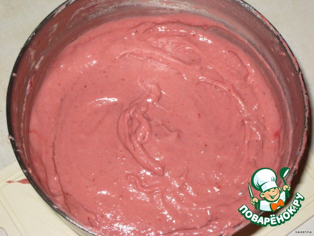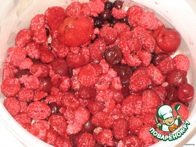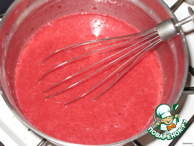 Для начинки ягоды пюрировать в блендере, протереть через сито, чтобы было однородное пюре без шкурок. Я насобирала все, что было в морозилке, немного клубники, вишня, черная смородина и малина.