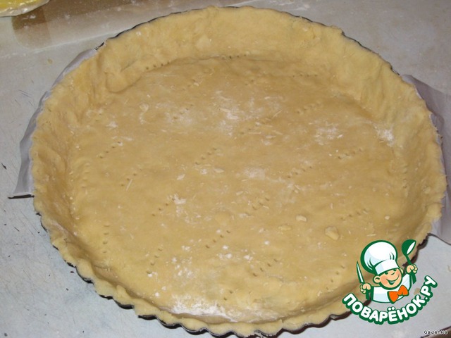 Тесто раскатать в тонкий пласт 3-4 мм толщиной, выложить в форму для тарта и сделать вилкой дырочки.