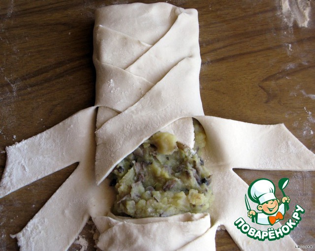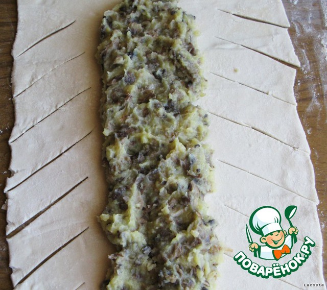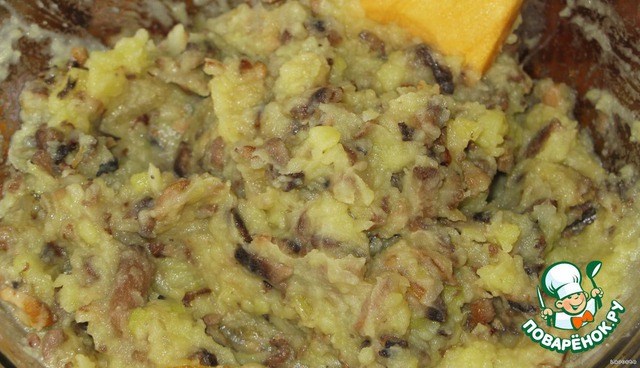 Картофель отвариваем, делаем пюре, соединяем с грибами и луком, солим и перемешиваем