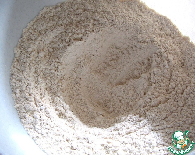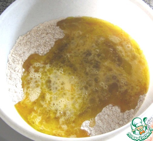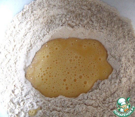 Сделать горку из муки с углублением в центре, добавить яйца.