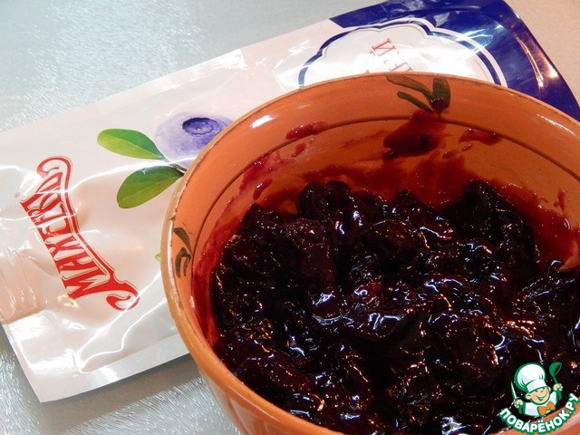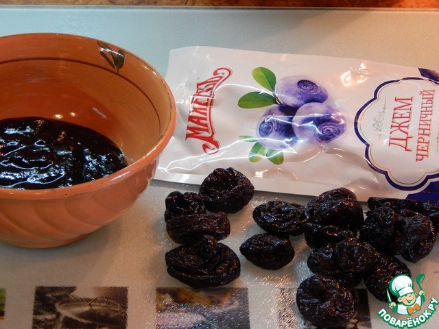 Чернослив нарезаем на кусочки, добавляем к джему и туда же добавляем крахмал. Все тщательно перемешиваем.
