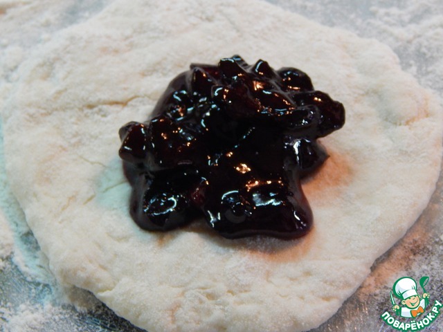 Тесто обмять, выложить на присыпанную мукой доску и еще раз вымесить. Делим тесто на 16 небольших кусочков. Раскатываем каждый в тонкую лепешку (примерно 4 мм). Выкладываем в центр лепешки начинку, края собираем, формируем круглый пирожок.