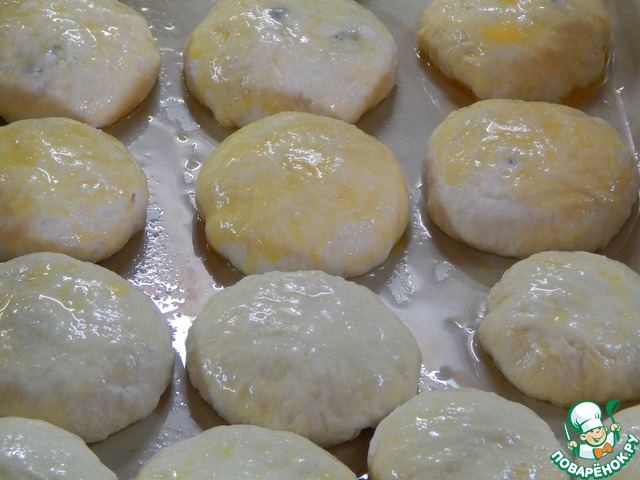Выкладываем пирожки на смазанный маслом противень. Пирожки смазываем слегка взбитым яйцом и ставим в разогретую до 190 градусов духовку на 40 минут.