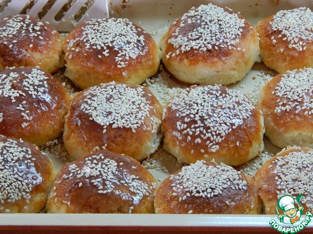 Готовим глазурь. Смешиваем сахарную пудру с лимонным соком. Готовые пирожки достаем из духовки, поливаем глазурью, пока они еще горячие, сразу же посыпаем кунжутом. Пирожки готовы.