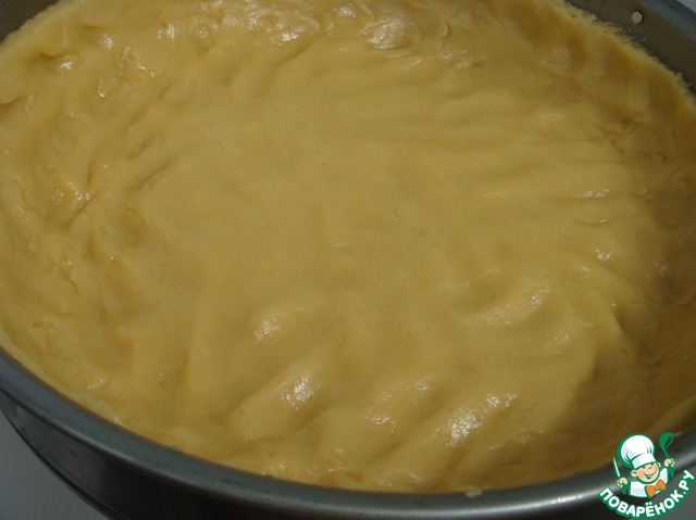 Выложить тесто в форму диаметром 26 см. (желательно разъемную) и руками распределить по всей поверхности, сформировав бортик, высотой примерно 3 см.