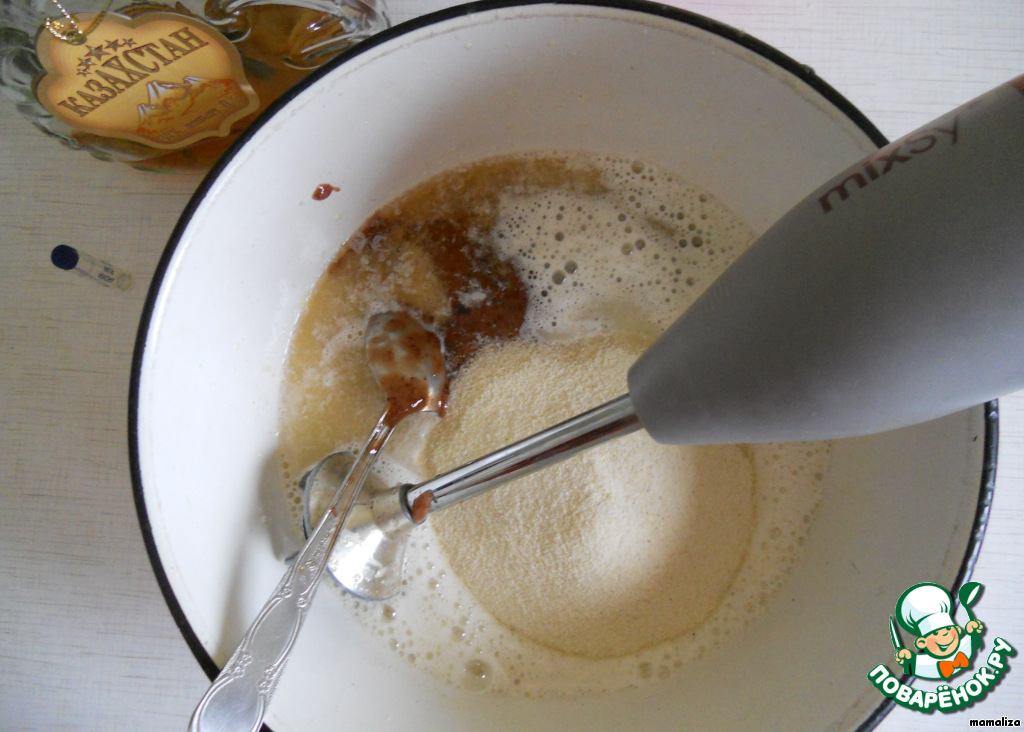 Добавить повидло. У меня было переваренное клубничное варенье. Я его измельчила блендером. Получилось замечательное клубничное повидло. Добавить манку и спиртное.