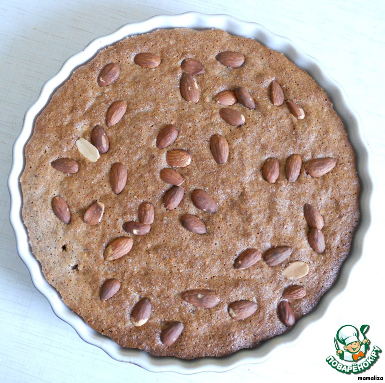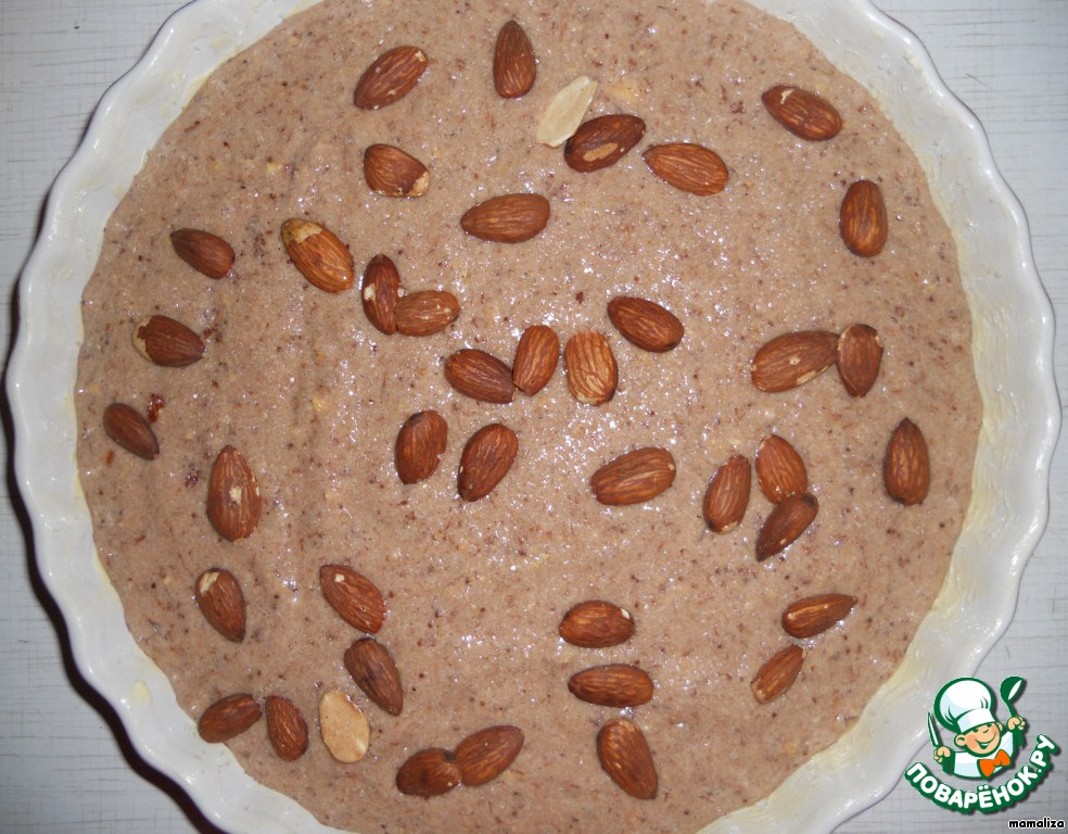 Тесто выложить в смазанную маслом форму. Сверху присыпать целым миндалем и сахаром.