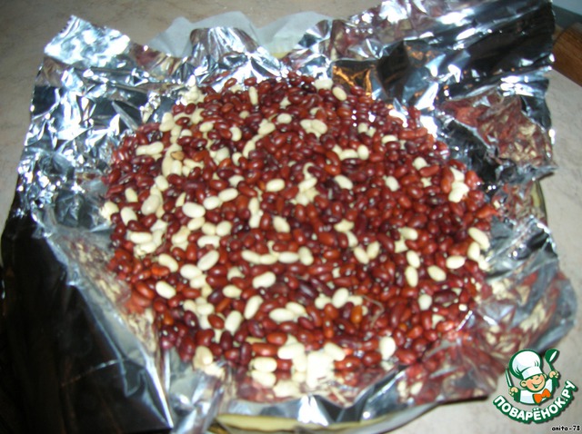 Кладем сверху фольгу и насыпаем фасоль. Печем в нагретой до 180гр. духовке 10 минут, затем снимаем фольгу и еще печем 10 минут. Немного охлаждаем.