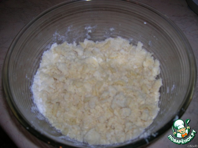 Муку просеиваем в миску, кладем туда размягченное сливочное масло и растираем до получения влажной крошки.