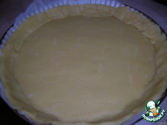 Охлажденное тесто достаем из холодильника, треть отделяем и откладываем. Оставшееся раскатываем в пласт. Форму смазываем маслом, застилаем пергаментом. Кладем в нее тесто так, чтобы получились бортики. Накалываем тесто вилкой.
