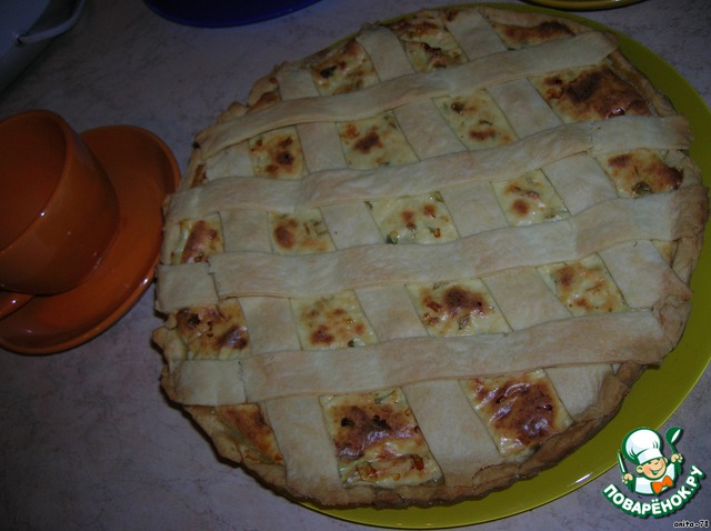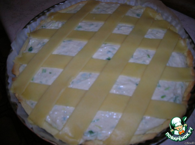 Выливаем начинку в форму. Оставшееся тесто тонко раскатываем, режем на полоски одинаковой ширины. Выкладываем на начинку в виде решетки. Печем 35-45 минут, пока верх не зарумянится.