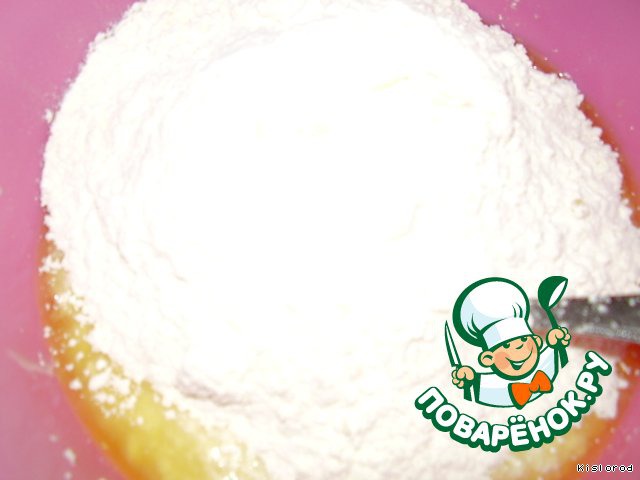 добавить муку и разрыхлитель теста, перемешать