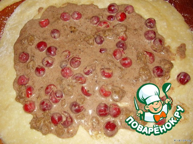 начинка: в отдельной емкости смешать марципановую массу, корицу, цедру лимона, сливки, черевишню без косточек;