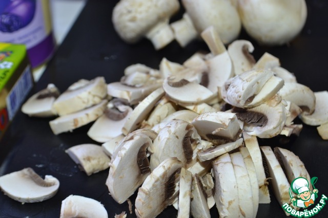 Шампиньоны моем, разрезаем пополам и режем тонкими пластиками.