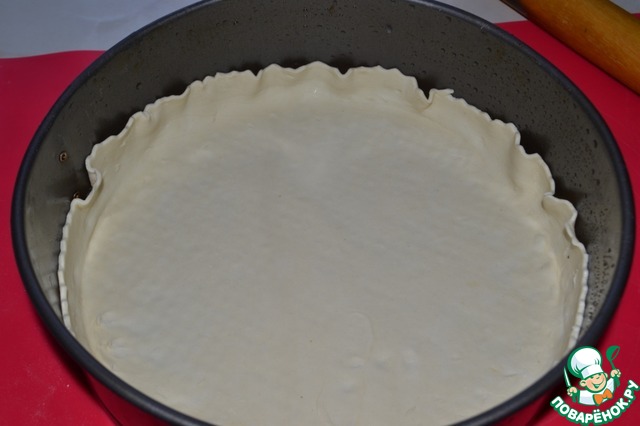 Тесто делим на 2 части. Раскатываем одну часть теста и выкладываем в смазанную растительным маслом форму (диаметр 24 см), делаем небольшой бортик.