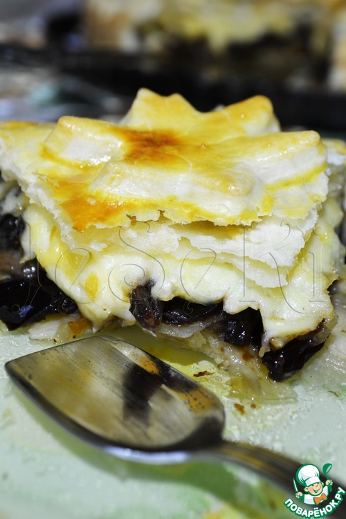 Выкладываем обжаренные с луком грибы, затем слой чернослива и сверху тертый сыр. Сыр обязательно поперчим.