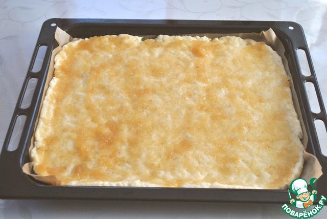 Распределить тесто на противне (30 х 36 см). Смазать подогретым джемом, в оригинале рецепта джем апельсиновый. У меня джем яблочный с лимоном и имбирем по рецепту с нашего сайта. Подогреваем джем для того, что бы он легко распределялся по тесту.