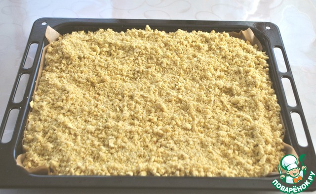 Для приготовления верхнего слоя просеять муку и перемешать с фисташковой мукой, сахаром, желтком. Добавить нарезанное кусочками масло. Перетереть массу руками или с помощью двух вилок до состояния, похожего на хлебные крошки.