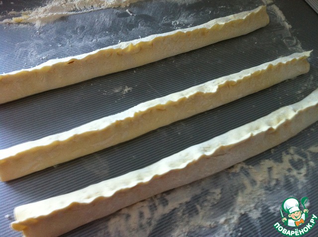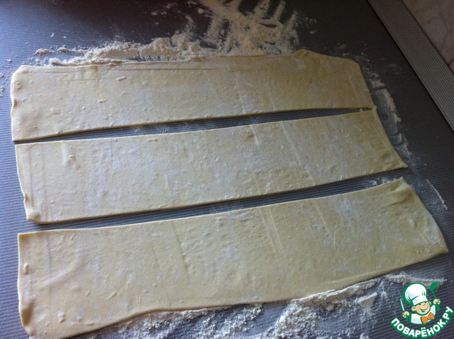 Для приготовления улитки слоеное тесто разделить на полоски и раскатать в длину.