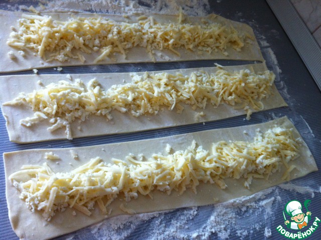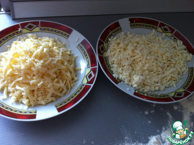 На каждую ленточку выложить горочкой сначала тертый адыгейский сыр, потом твердый сыр.