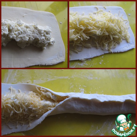 Выложить творожную начинку, затем тертый любой сыр, закрепить края, сформировать маленькую улитку.