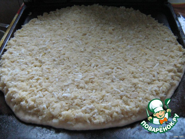 Другую часть теста раскатываем на 1сантиметр больше 1 части . Накрываем и загибаем осторожно в низ . Ставим в тепло чтоб ещё раз поднялся .Смазываем яйцом .