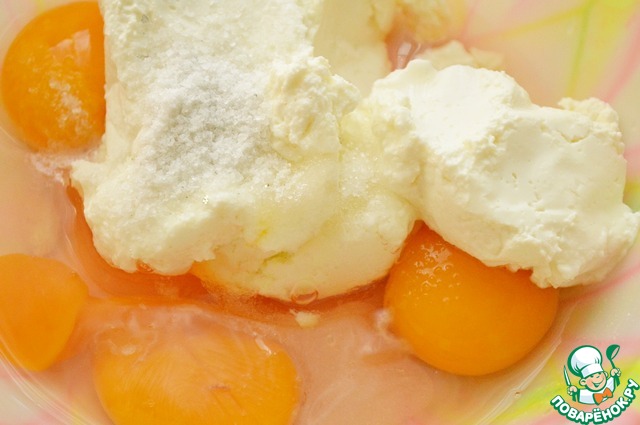 1. Яйца (немного желтка отложить для смазки пирога), растереть с творогом, солью и сахаром. Добавить мягкое сливочное масло, перемешать венчиком.