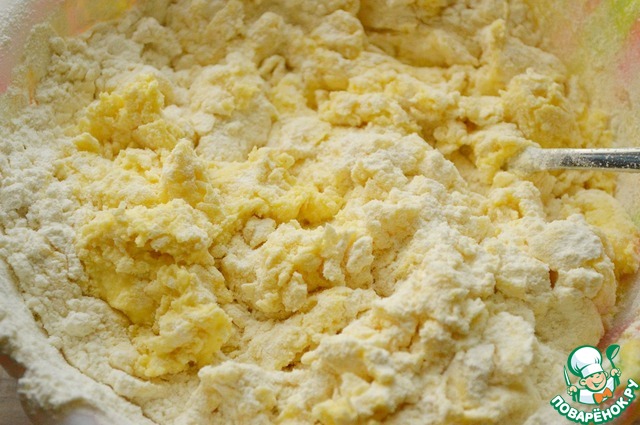 2. Муку просеять с разрыхлителем, ввести в творожную смесь, замешивая мягкое, эластичное тесто.