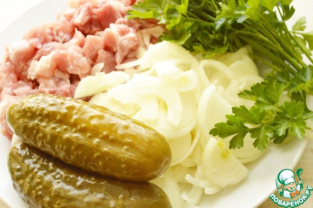 3. Лук нарезать полукольцами. Сыр натереть на терке. Мясо и огурцы нарезать мелким кубиком или мясо пропустить через мясорубку. Петрушку измельчить. На сковороде разогреть масло, обжарить лук до прозрачности, добавить мясо, обжарить 5-7 минут, затем накрыть крышкой и тушить еще 10 минут. Затем добавить огурцы, тушить еще 5 минут. Посолить и поперчить по вкусу.