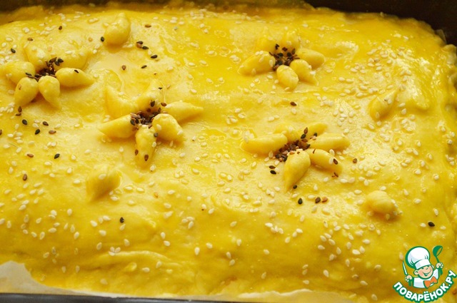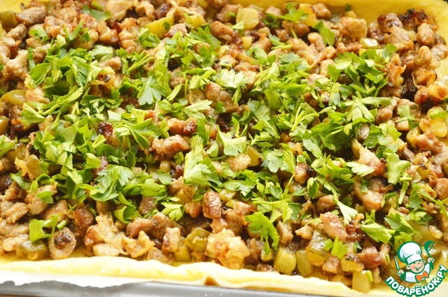 4. Тесто разделить на 2 части. Первую часть раскатать в прямоугольник, выложить в форму. На тесто выложить половину сыра, сверху мясную начинку, петрушку и снова сыр. Вторую часть теста раскатать и накрыть начинку. Края пирога защипнуть, смазать взбитым желтком и посыпать кунжутом.