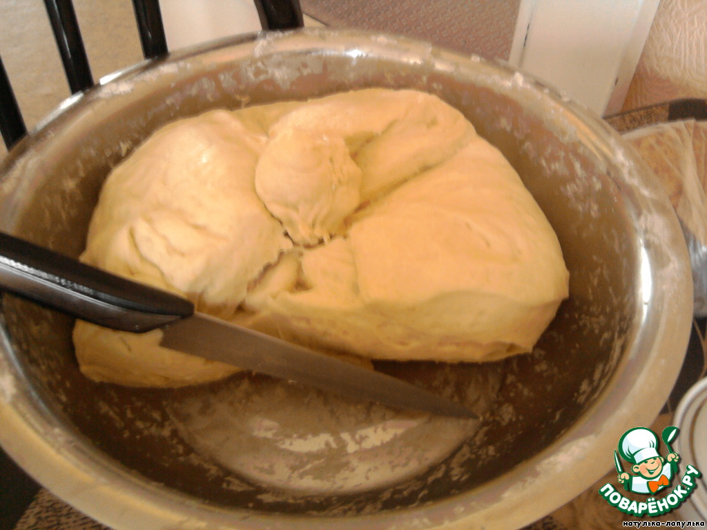 Как подойдет (увеличится в 2-3 раза), необходимо его обмять, нужно смазать руки растительным маслом и хорошенько опять вымесить. И снова оставить подходить примерно на 1 час. Оно вновь должно увеличится в 2-3 раза. После этого тесто готово к разделке. Больше приминать и давать подходить не нужно, иначе тесто перекиснет.