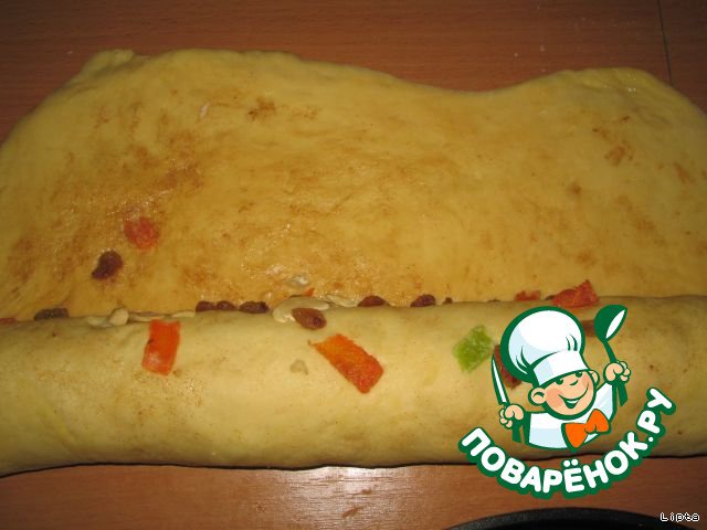 Равномерно распределить на тесте изюм, цукаты, посыпать ванильным сахаром, корицей.