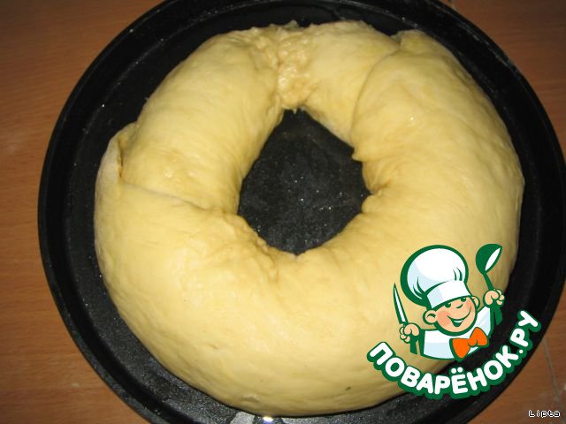 Подошедшее кольцо аккуратно смазать взбитым желтком или яйцом, стараясь не смять его.