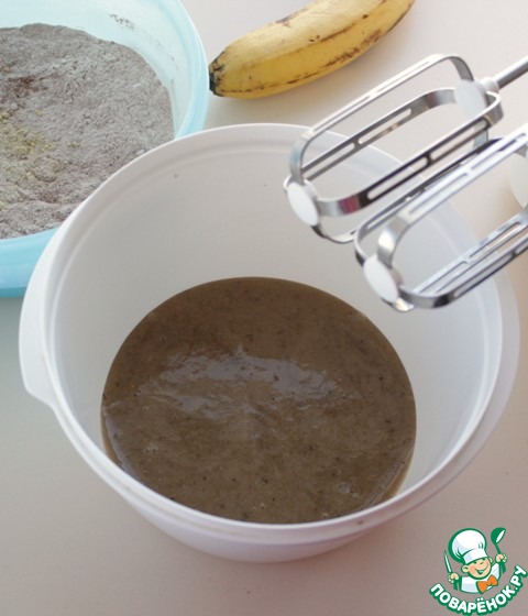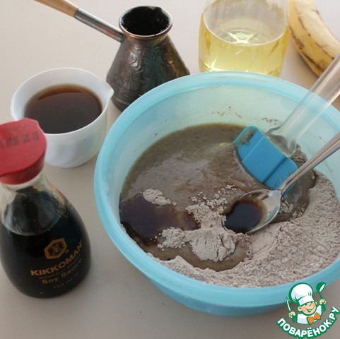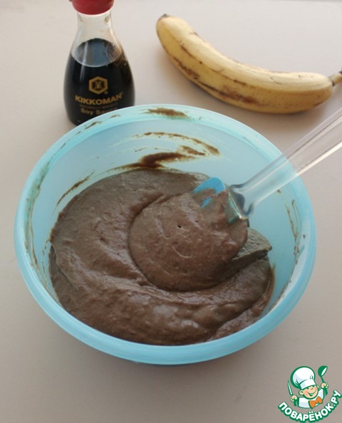 Муку просеять с разрыхлителем, содой и какао. Добавить банановое пюре, соевый соус Киккоман, растительное масло и кофе. В зависимости от муки, кофе понадобится 150-200 мл.