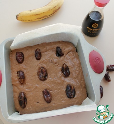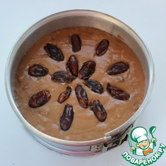 Тесто из замороженных бананов выложить в форму, смазанную маслом или застеленную кулинарной бумагой, сверху вдавить финики. Эта форма 21*21 см.