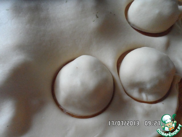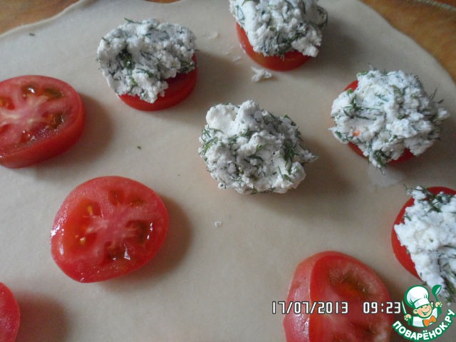Тесто делим на 2 части, раскатываем тонко, выкладываем кольца помидора друг от друга подальше, на кольца укладываем начинку из творога и закрываем вторым раскатанным листом теста, берем стакан и выдавливаем круглые пирожки, лишнее тесто убираем и снова рарскатываем и делаем пирожки.