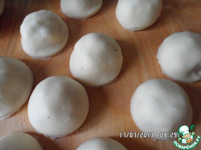 Тесто: муку просеиваем в чашку - 2 стакана, добавляем соли немного (щепотку), масло подс. - 2 стол. ложки, заливаем потихоньку, помешивая ложкой, стаканом кипятка, вымешиваем тесто руками, тесто должно быть эластичным, при раскатке теста муку на доску сыпать не придется, так как тесто не прилипает.