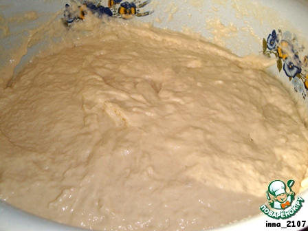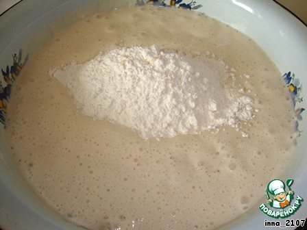 В теплое молоко всыпать соль, сахар, примерно 200 г муки и дрожжи и хорошо перемешать.
