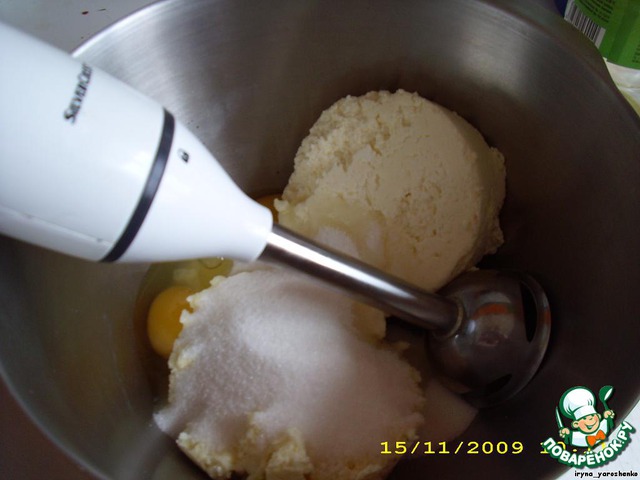 Сначала подготовим творог. Разотрем творог, 3/4 ст сахара, винильный сахар, 2 яйца до однородной массы. Выложим творог в кондитерский мешок или в плотный кулек с отстриженным уголком.